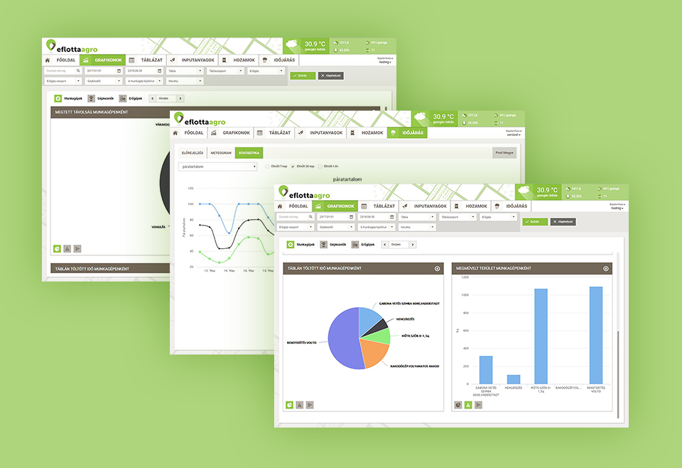 Rendszerünk segítségével a flottakezelés, nyomkövetés, üzemanyag elszámolás és riportolás válik megoldottá, sőt térképen vizualizált földterületek, munkagép mozgások és statisztikák is láthatóvá válnak, valamint termény és időjárás információk is rendelkezésre állnak.